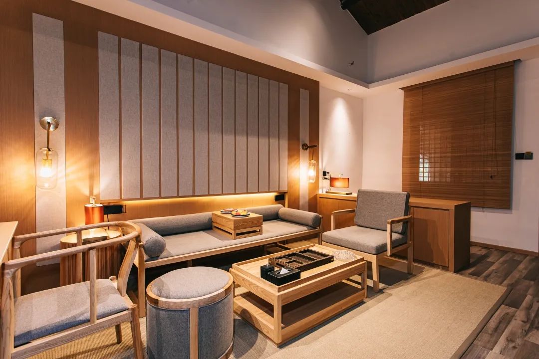 民宿內(nèi)也不遜色,暖色新中式質(zhì)樸風(fēng)格,視線沿著大門望去,簡約古樸的設(shè)計(jì)映入眼簾,也許只有在進(jìn)門的一刻,“遠(yuǎn)離塵世”才有了全新的定義。