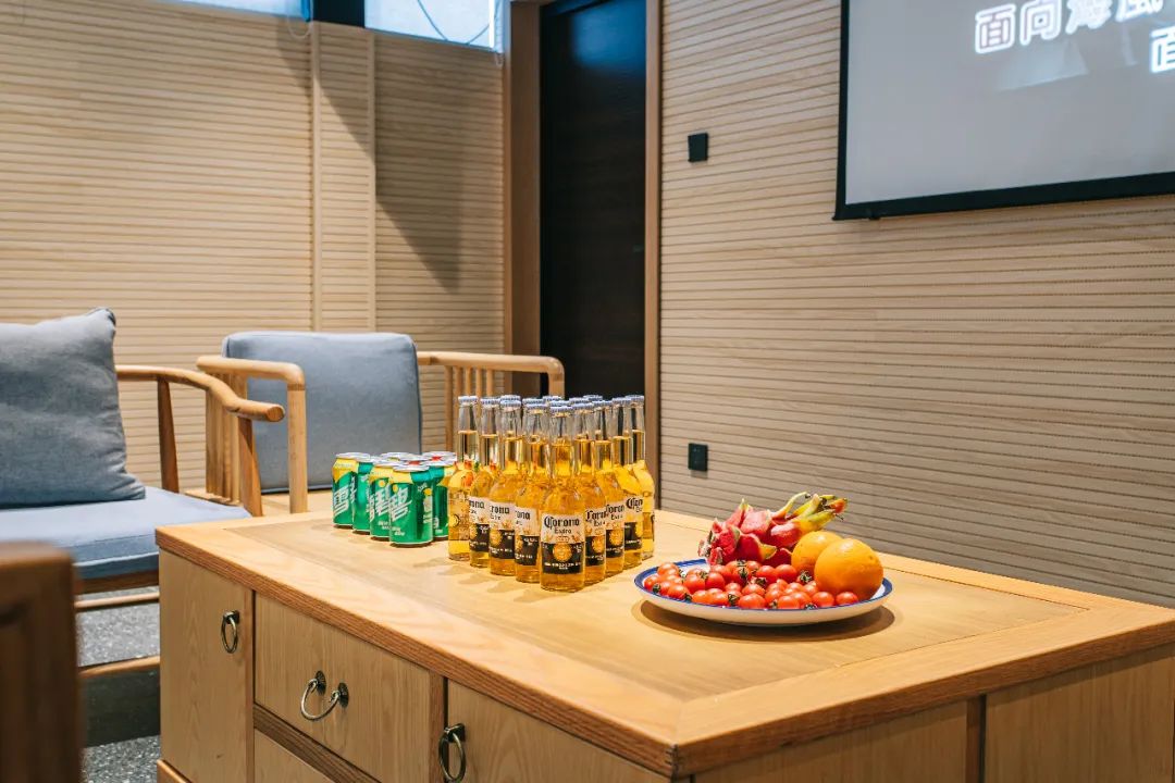靠近投屏的前方是四方小茶幾與沙發(fā)組成的“唱K空間”,后側(cè)由長方桌組成的“桌游空間”,唱K、桌游兩不誤~